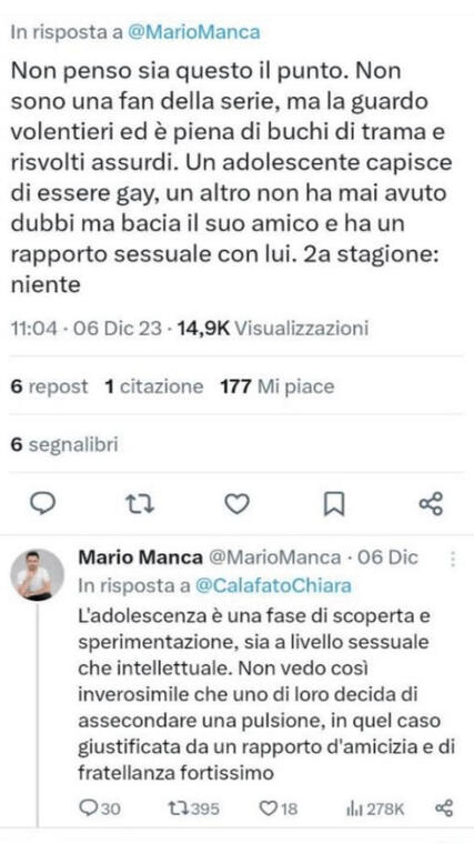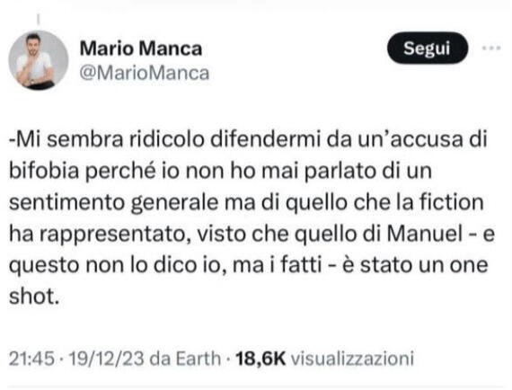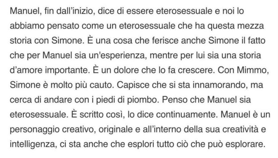 Here in Italy Manuel - due to the biphobic declarations of the main screenwriter Sandro Petraglia - has been transformed into a straight character and his path of discovery and acceptance, which timidly was about to begin at the end of the first season, was completely nipped in the bud and forgotten as if nothing had happened.Below is a "small" list of the ways in which this character's bisexuality has been debased in recent weeks by who has directly worked in the show (like screenwriters and actors) and by journalists:1) We thought of Manuel as a heterosexual who has this half-affair with Simone (Sandro Petraglia for Fanpage)2) For Manuel it's just an experience (Sandro Petraglia for Fanpage)3) Manuel is a creative, original character and within his creativity and intelligence, he also wants to explore everything he can explore (Sandro Petraglia for Fanpage)