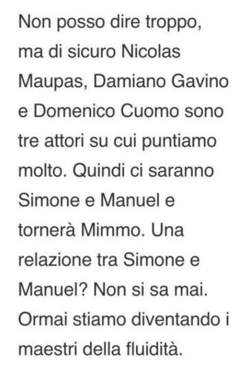 Throughout the first season with the character of Manuel because, even though he is conceived and written as a heterosexual character, we have an entire season made up of glances between Simone and Manuel which will culminate on the evening of Simone's birthday with a kiss (which Manuel himself starts) and with making love (as written by Rai in the official synopsis).