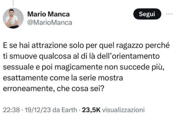 7) And if you are only attracted to that one guy because something moves you beyond sexual orientation and then MAGICALLY it doesn't happen anymore, exactly as the series WRONGLY shows, what are you? (Mario Manca via X)